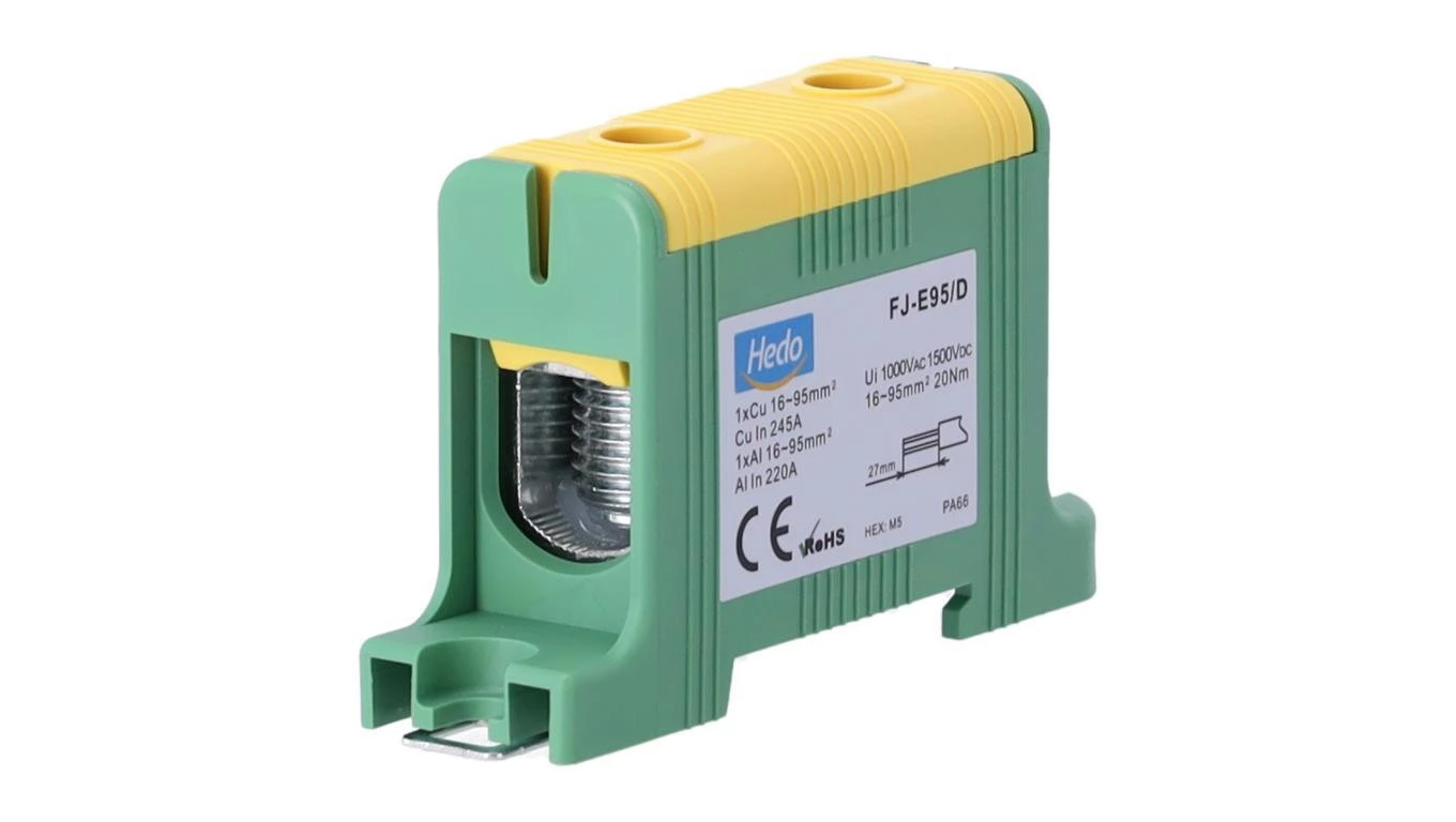 Blok rozdzielczy odgałęźny Al/Cu 16-95mm2 (max. 95mm2) na szynę TH35 żółto-zielony FJ-E95/D HEDO