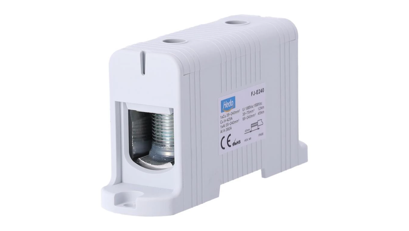 Blok rozdzielczy odgałęźny Al/Cu 35-240mm2 (max. 240mm2) na szynę TH35 szary FJ-E240 HEDO