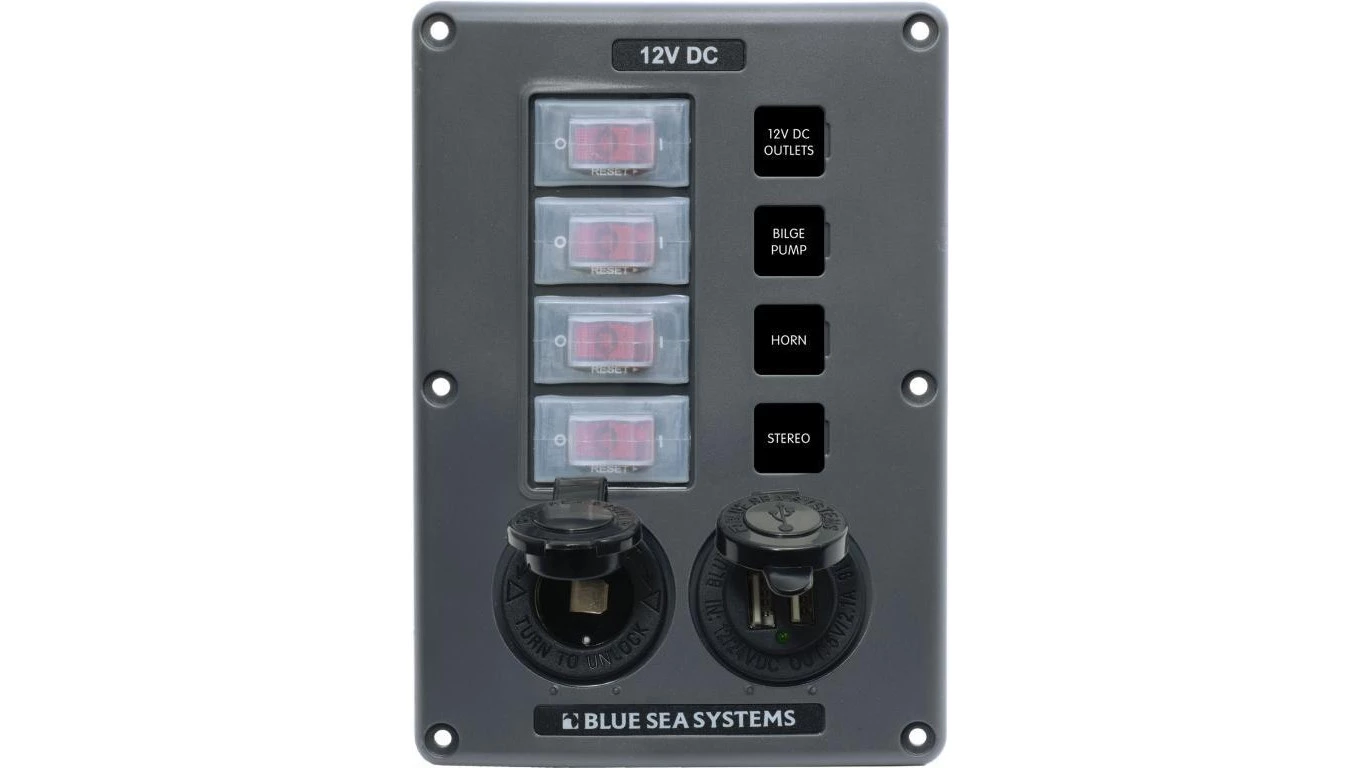 Blue Sea wodoodporny panel 4 obwody, gniazdo 12V i podwójna ładowarka USB