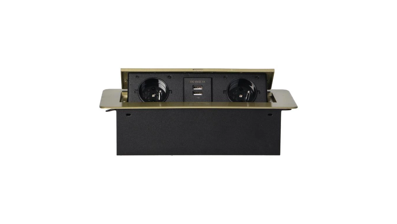 Gniazdo wpuszczane w blat 2x 230V 2P+Z + 2x ładowarka USB 5V/2.1A mosiądz