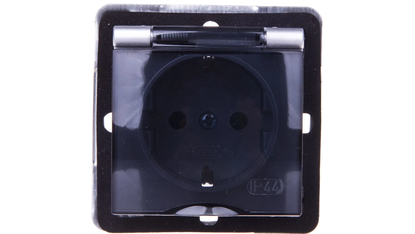 IMPRESJA Gniazdo bryzgoszczelne z/u Schuko IP44 z przesłonami klapka przezroczysta srebrne GPH-1YSP/m/18/d