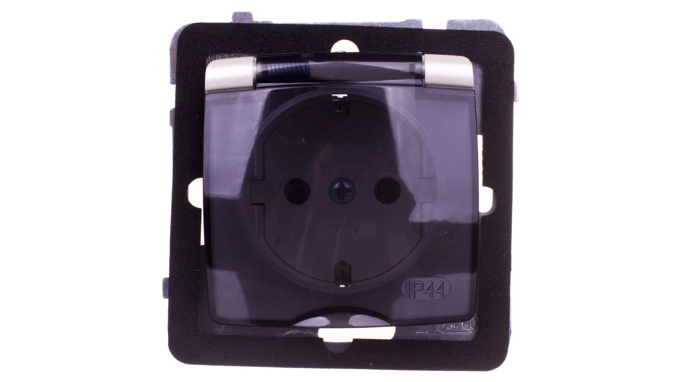 KARO Gniazdo bryzgoszczelne z/u Schuko IP44 klapka przezroczysta ecru perłowy GPH-1SS/m/42/d