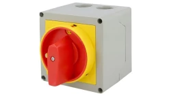 Łącznik krzywkowy 0-1 3P 20A w obudowie z pokrętłem żółto/czerwonym blokowany kłódką GX2010P25