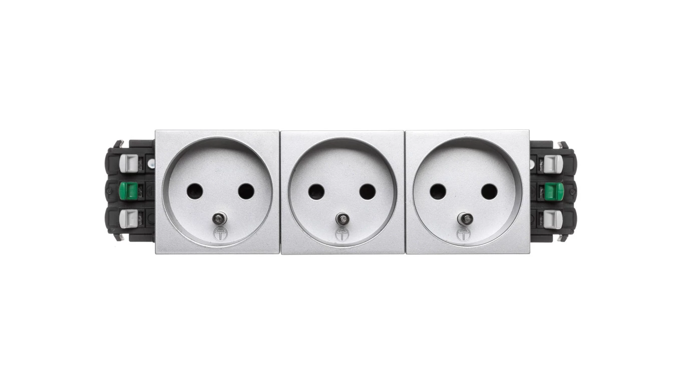 Simon 55 Gniazdo wtyczkowe podwójne z uziemieniem z przesłonami (moduł) 16 A 250 V~, szybkozłącza Jasnoszary mat TGZ2MCZ.01/114