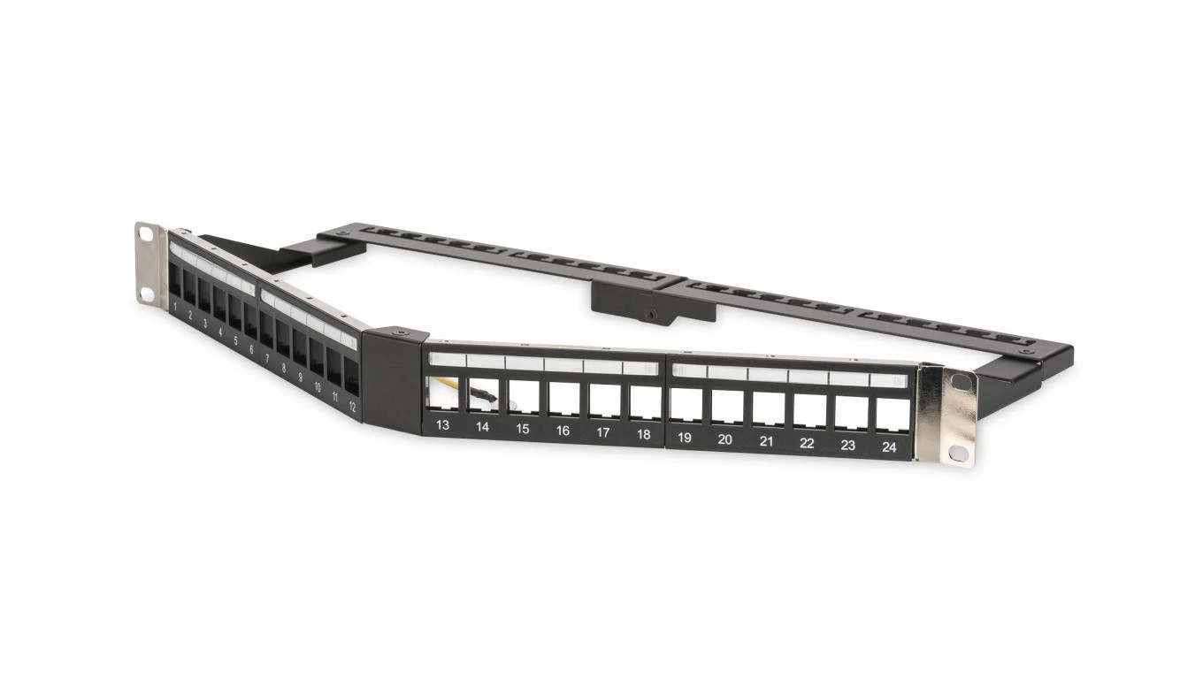 Panel krosowy kątowy 19 24x keystone, ekranowany,1U, czarny, prowadnica kabli, pola opisowe DN-91414S