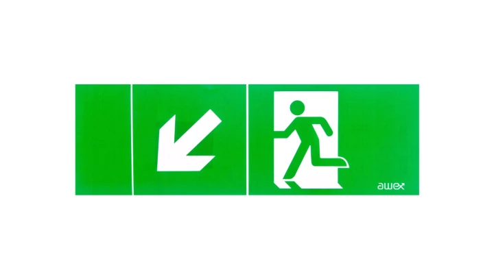 Piktogram PM26 100x300 strzałka dół człowiek w drzwiach logo awex (ISO7010)