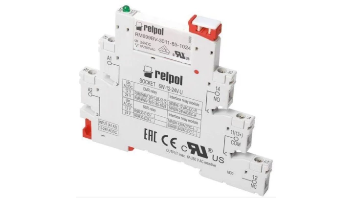 Przekaźnikowy moduł sprzęgający 6,2mm, 1P 6A 12V AC/DC, styki AgSnO2, zaciski śrubowe, szyna DIN 38.51.0.012.4060