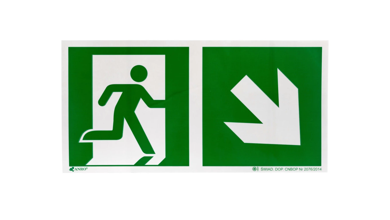 Samoprzylepna tabliczka ostrzegawcza /Kierunek do wyjścia w prawo i w dół/ IE/002/2/A/FS