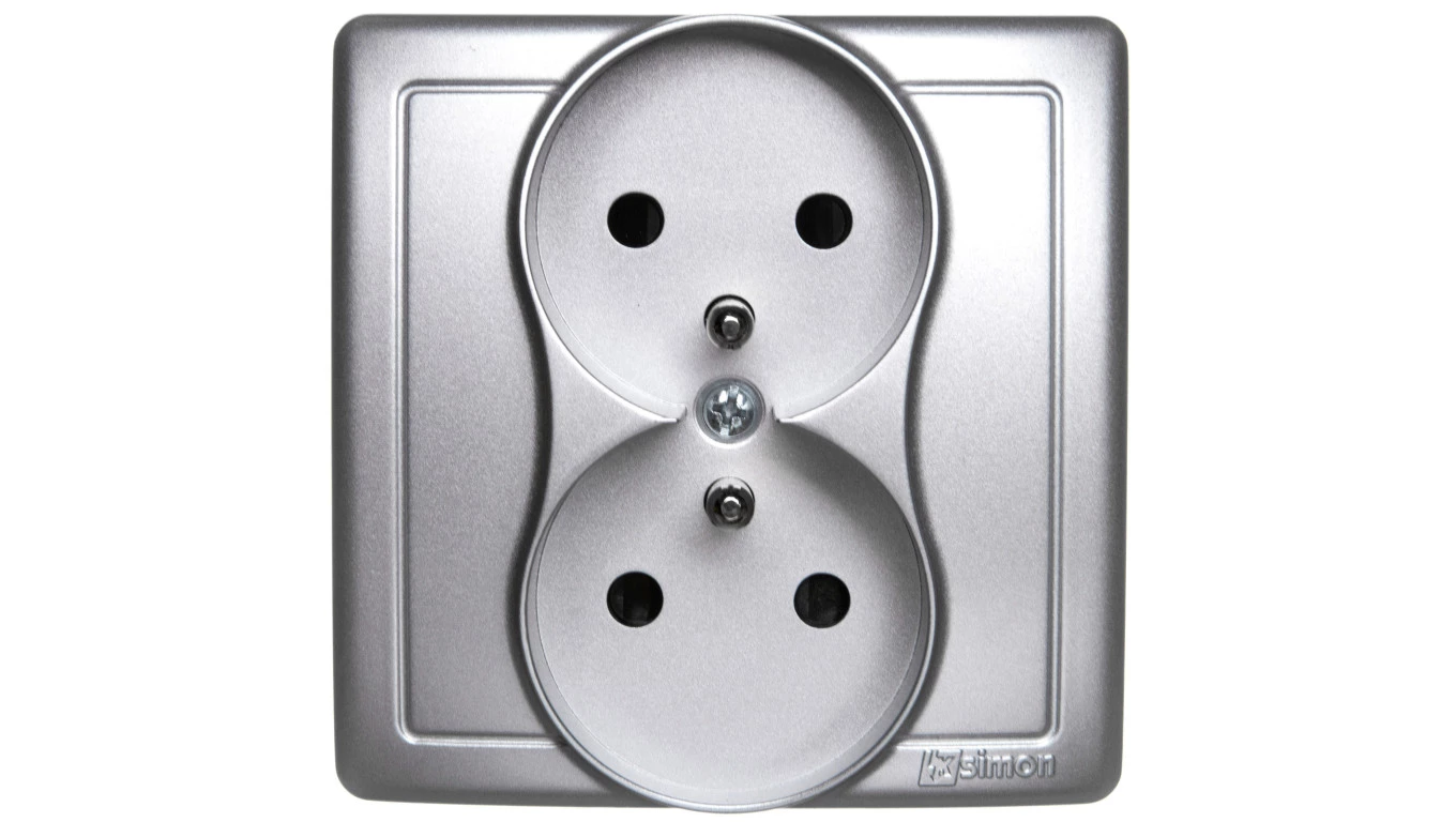 Simon 54 Gniazdo podwójne SCHUKO z/u 16A IP20 z przesłoną torów srebrny mat DGSz2Z/43