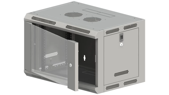 Szafa rack wisząca 19 cali 9U 600x600, niedzielona, drzwi szklane, kolor szary FLAT PACK
