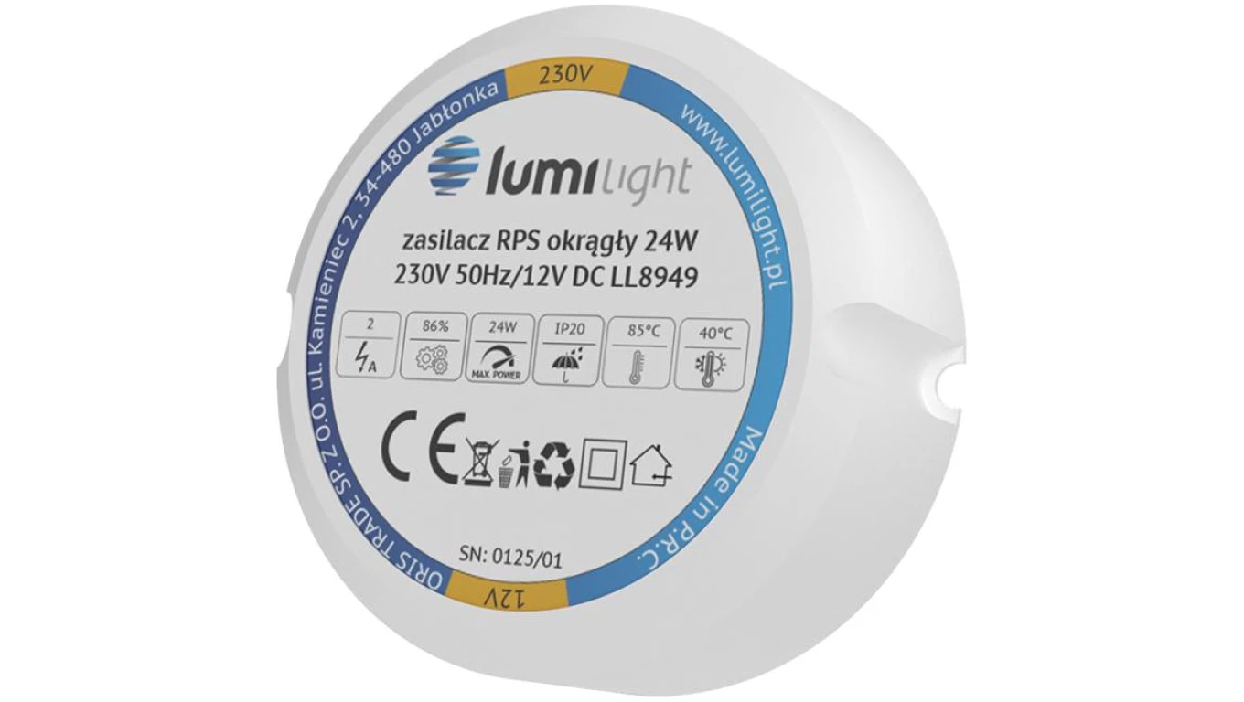 Zasilacz do puszki instalacyjnej, IP20, średnica 55mm, głębokość 22mm, 12V 2A 24W uniwersalny Lumilight