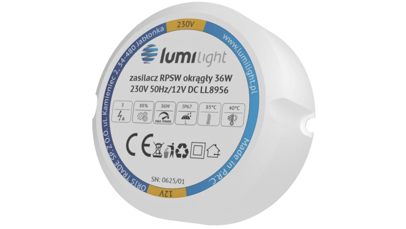 Zasilacz do puszki instalacyjnej, IP67, średnica 55mm, głębokość 22mm, 12V 3A 36W uniwersalny Lumilight