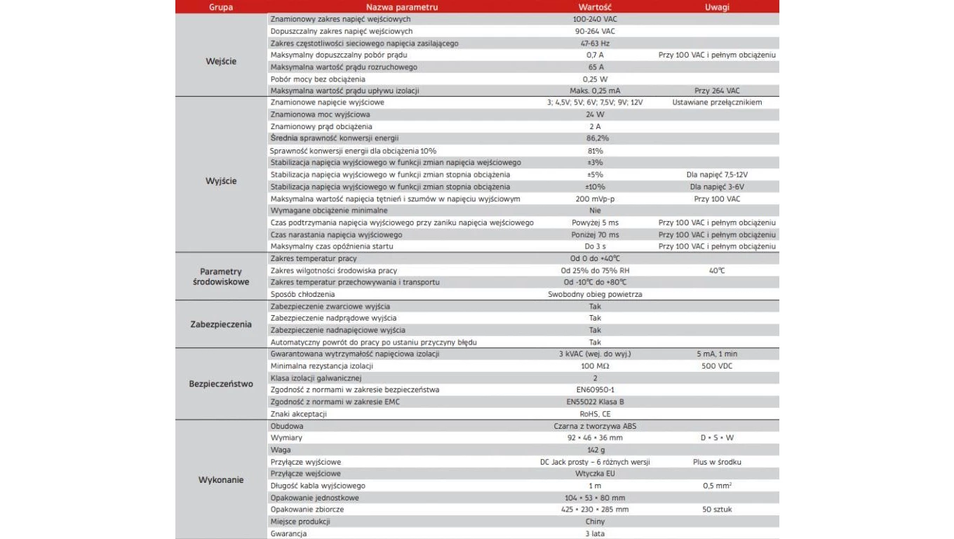 ZASILACZ WTYCZKOWY 3-12V 2A 1m. 3V 4,5V 5V 6V 7,5V 9V 12VDC REGULOWANY ESPE