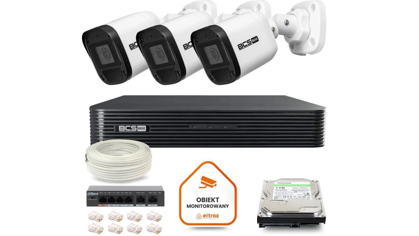 Zestaw monitoringu IP BCS Basic 3x Kamera BCS-B-TIP15FR3(2.0) Rejestrator z dyskiem 1TB